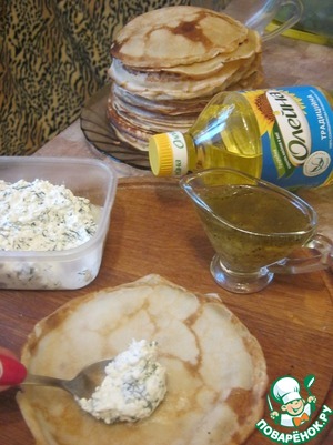 Рецепт «Блины с сырной пикантной начинкой и соусом»: