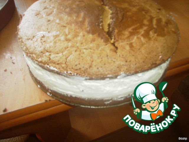 # Когда всё немного застынет, соединить два коржа, для этого аккуратно перевернуть корж со сгущёнкой на сливки в разъемную форму, оставить торт в холодильнике до застывания, лучше на ночь.