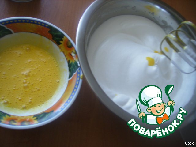 Белки взбить отдельно от желтков с сахаром, добавить взбитые желтки, ввести растопленный шоколад с ложкой сливок (лучше растопить на водяной бане), непрерывно взбивая миксером, добавить просеянной муки с разрыхлителем в несколько приёмов, аккуратно мешая ложкой снизу вверх. Разъёмную форму застелить пергаментом, выпекать при температуре 180 гр. 30-35 мин, первые 25 минут не открывать.