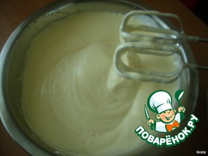 # Сливки взбить миксером с сахаром и закрепителем, на дно разъёмной формы уложить 2-й корж, выложить сливки и разровнять, поставить в холодильник.