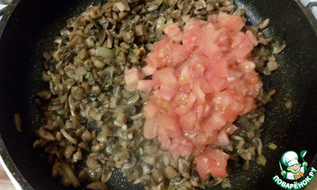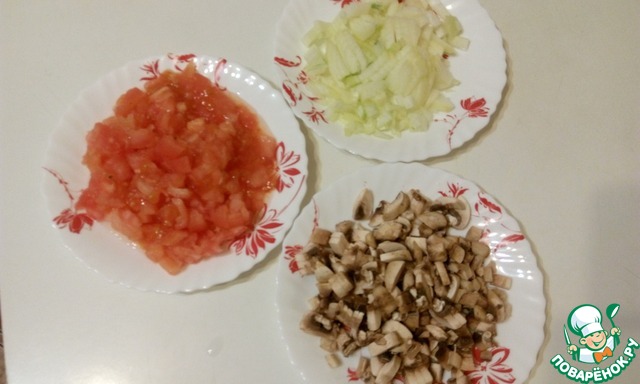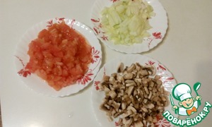 Помидор бланшируем и снимаем кожицу. Режем кубиками: помидор, лук и шампиньоны.