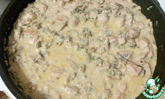 Через 10 минут открываем крышку и выпариваем сливки до загустения. В конце выдавливаем чеснок через пресс, можно добавить любимые приправы и соль.