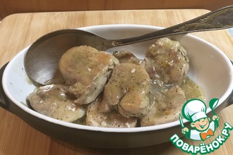Куриное филе режим кусочками 2 - 2,5 см. Делаем маринад из соевого соуса, горчицы и хмели-сунели. Кладем в него филе и в холодильник на 2 часа. Время приготовления я указала без маринования.