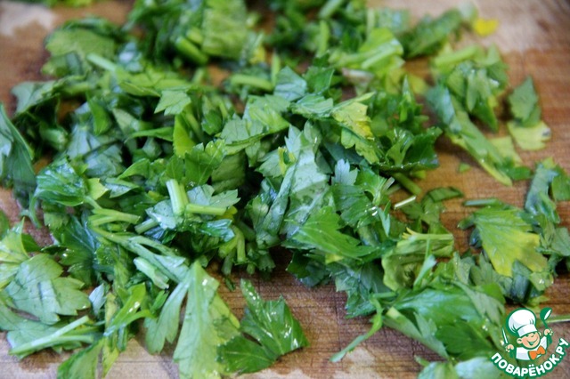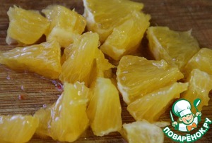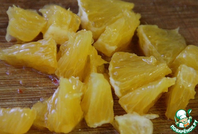 • Апельсин делим на дольки, очищаем от пленки на режем на мелкие кусочки,