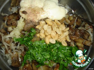 Потом в глубокую миску переложить и перемешать, добавить чеснок (через пресс), зелень петрушки+орешки+майо нез.