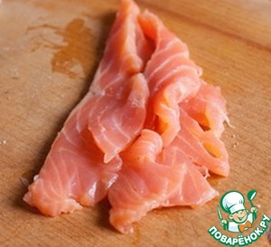 Слабосоленый лосось нарежьте произвольно, можно использовать подкопченый. Я брала семгу, но подойдет любая лососевая рыба - форель, кета, горбуша, нерка.