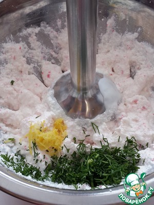 Крабовые палочки, лосось и сливочный сыр измельчите блендером. Если соус получается густой, подлейте немного сливок. Добавьте соль по вкусу, укроп и цедру лимона, перемешайте.