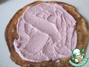 Вливаем полученный крем в форму с блинчиками, покрываем сверху еще одним блинчиком. Ставим в холодильник до полного застывания.