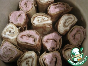 Блинчики с творожной начинкой нарезаем и раскладываем в стоячем положении чередуя цвета. Можно блинчики распределить одним слоем или 2 в зависимости от высоты нарезанных блинчиков