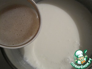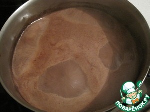 Готовим глазурь. Сахар смешиваем с какао-порошком, добавляем молоко, доводим до кипения, кипятим 5 мин. Слегка охлаждаем.