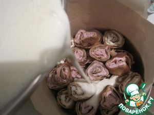 Чтобы процесс пошел быстрее блинчики раскладываем в нахлест, распределяем начинку и сворачиваем.