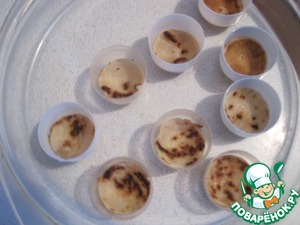 Готовим украшение грибочек из блинчика. Вырезаем круг, кладем в небольшое углубление, ставим на 30 сек. микроволновку.