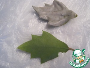 Готовим листики из шоколада. Из растопленного белого (он у меня подкрашен) или темного шоколада подкрашиваем листочки, даем застыть, затем снимаем листочек.