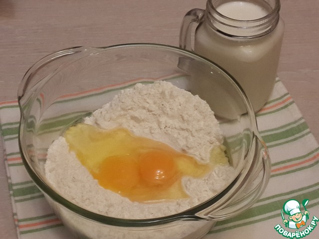 Для блинов просейте в миску муку, смешайте её с солью, сахаром, корицей, вбейте 2 яйца и начните добавлять молоко, размешивая венчиком, чтобы не было комков.