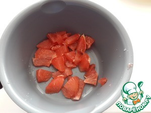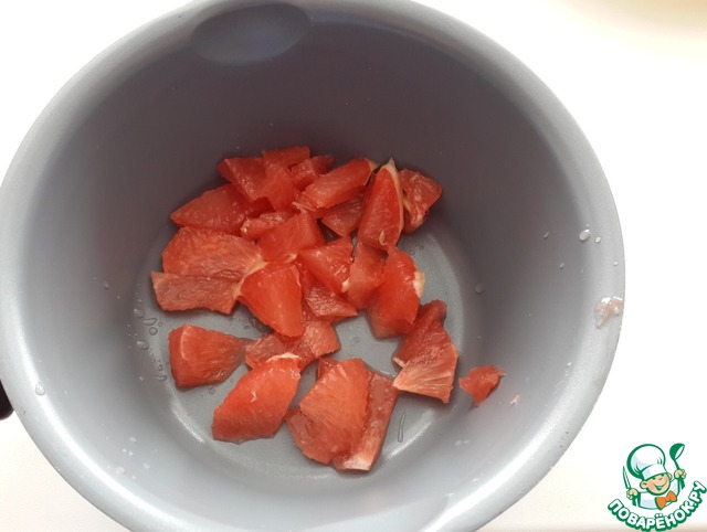 Для соуса грейпфрут очистите от кожуры и плёнок, нарежьте на маленькие кусочки, сложите в ковш.