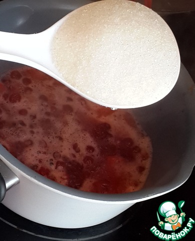 Добавьте замороженную бруснику, влейте вино и сок и поставьте кипятить.
