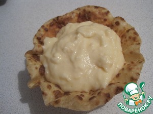 На блинчик смазываем сырный соус в горячем виде