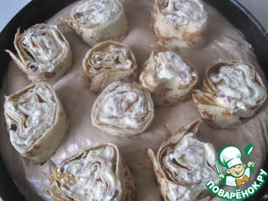 • Сворачиваем рулетом, нарезаем на кусочки по 4 см.