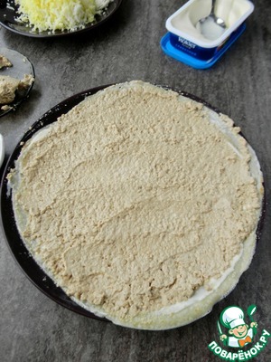 Накрыть вторым блином и снова смазать сыром.