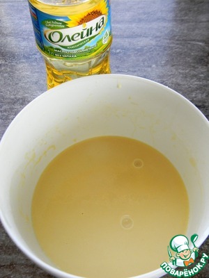 Яйцо взбить с сахаром и частью молока. Высыпать муку, взбить. Добавить оставшееся молоко и масло. Взбить, чтобы не было комочков.