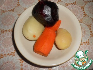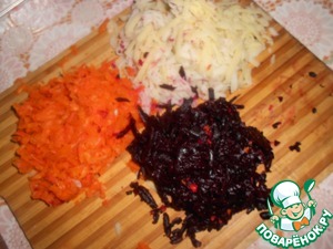 Натереть картофель, морковь и свеклу на крупной терке по отдельности.