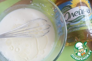 Для блинов: в теплом молоке растворить сахар и соль. Добавить яйца, подсолнечное масло, все перемешать. Муку смешать с разрыхлителем и небольшими порциями ввести в тесто. Все хорошо перемешать, чтобы не оставалось комочков.