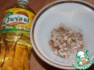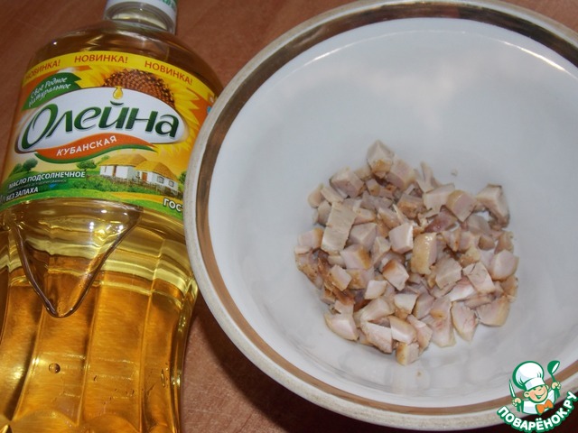 Куриное филе обжарить на растительном масле до готовности, мелко порезать.