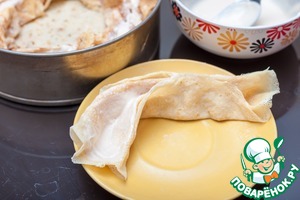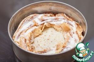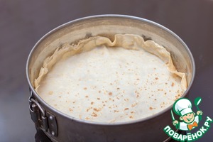После того, как все блины испечены, возьмите самый толстый блинчик и положите его в смазанную маслом разъемную форму так, чтобы образовался небольшой бортик. Поставьте форму в духовку на 5-10 минут при 180-190С, чтобы блин подсох и хорошо держал форму.