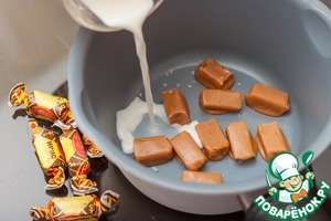 А мы тем временем займемся простейшим карамельным соусом - 20 ирисок положите в сотейник, поставьте на средний огонь и влейте молоко, нагрейте до кипения, постоянно перемешивая. Снимите с огня и охладите.