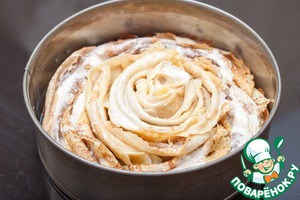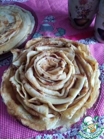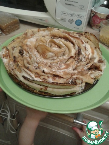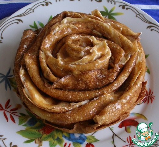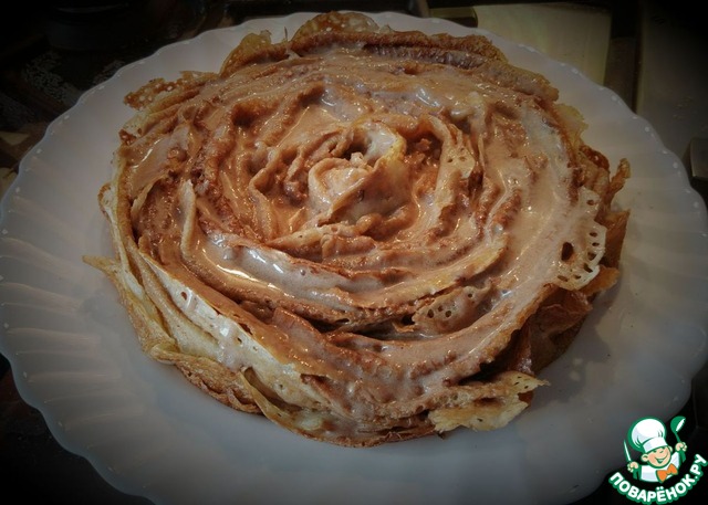 Такой торт, напоминающий распустившийся бутон розы, украсит ваш стол и на масленичной неделе, и в будни, а карамель из ирисок сделает его вкус незабываемым.