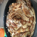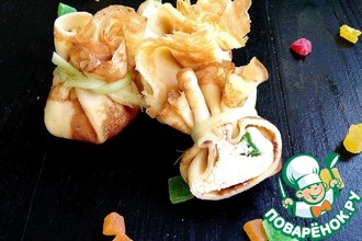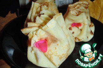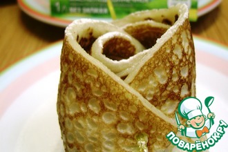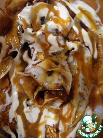 На каждый блин равномерно нанесите по 2 ст. л. карамельного соуса, сверните блин гармошкой.