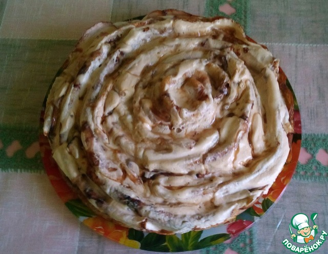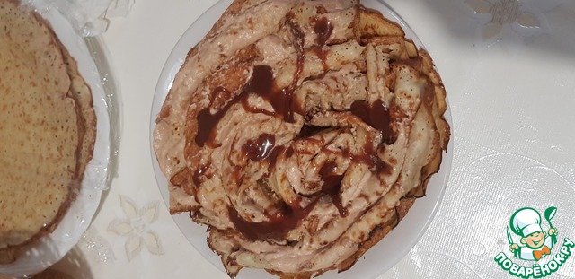 Старайтесь, чтобы ажурные края блинчиков слегка выглядывали наружу, легкая небрежность в формовке торта придаст ему очарование и шарм.