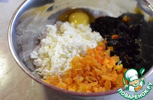 В миске смешать творог, курагу и чернослив. Сахара в начинку мы не добавляем, так как само по себе это уже сладко, плюс суфле пропитает блины дополнительно своей сладостью.