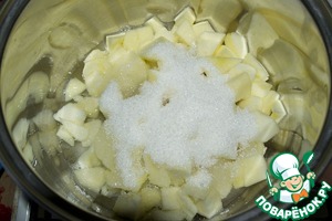 Выложить яблоки в кастрюлю, добавить сахар, воду, готовить 10-15 минут до мягкости.
