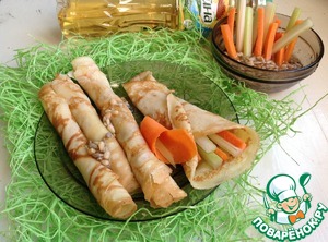 Морковь с сельдереем помыть, почистить и нарезать брусочками. Блин смазать орехово-медовой начинкой и выложить брусочки сельдерея и моркови. Свернуть блин конвертом или кулечком.