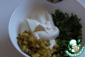 К зелени добавляем сметану и мелко-мелко нарезанный огурчик. Я всегда использую квашенный.