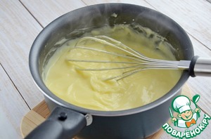 Заварной крем сверху закрыть пищевой пленкой, пленку уложить на поверхность крема, так он не будет заветривать, оставить его до полного остывания. Я поставила сотейник с кремом в ледяную воду, чтобы быстрее охладился.