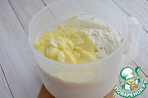 Сливки 500 г 33% жирности взбить в пышную массу с сахарной пудрой, добавить остывший крем. перемешать лопаткой.