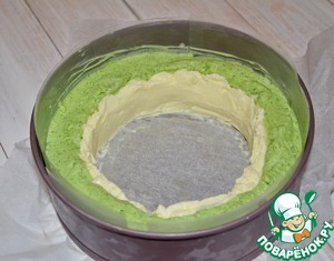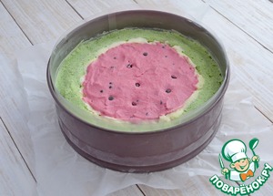 Дно формы диаметром 20 см застелить пекарской бумагой, стенки формы застелить пластиковыми файлами или дно и стенки формы затянуть пищевой пленкой. Аккуратно выложить слой мятного мороженого, потом слой белого.
