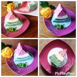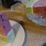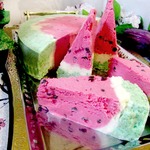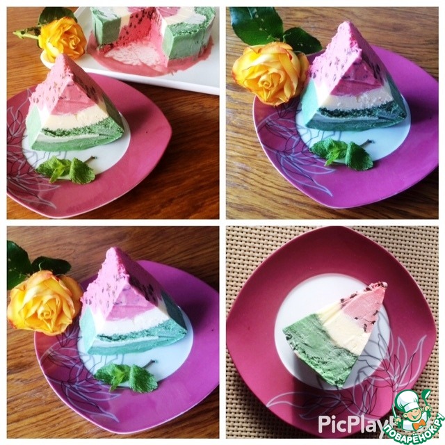 [+5]я готовила уже за-полночь, и перемешать получилось только 3 раза в течении первых двух часов. собирала уже утром, немного подержав в холодильнике. оно, конечно, уже застыло и сложно формировалось. даже думала, не подать ли просто разноцветными шариками, но все таки постаралась придать нужную форму и не прогадала. В середине у меня клюква вместо малины. самый вкусный слой оказался-кислинка и аромат клюквы сюда очень хорошо вписался. зеленый-просто краситель. шпината я не нашла в продаже.