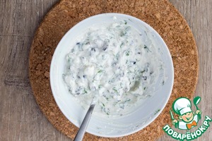 Для приготовления соуса в греческом стиле смешаем греческий йогурт с фетой, мелко рубленной петрушкой и чесноком. Из оливок достанем косточки, мелко порубим и добавим к соусу. Соль не требуется, т. к. фета дает достаточно солености. Добавим растительного масла.