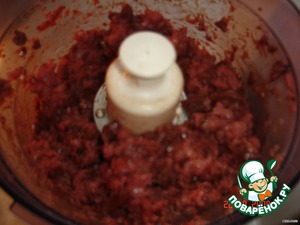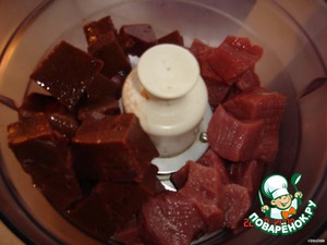 Мясо и печень порезать на кусочки и поместить в кухонный комбайн