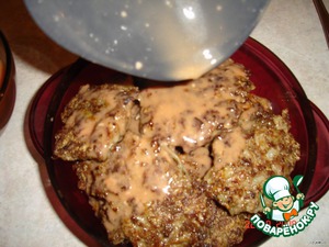 Столовой ложкой выкладываем массу и прижимаем слегка ложкой, т.к. печень имеет свойство растекаться, края котлеток тоже ложечкой формируем