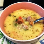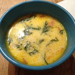 Теперь удаляем из бульона стебли укропа, добавляем картофель, мясо и пережарку, 3 столовые ложки сливочного плавленого сыра, перемешиваем и варим мин. 10 на среднем огне, до готовности картофеля. Далее солим, перчим по вкусу. Даём мин. 5 настояться и разливаем по тарелкам, добавляем укроп.