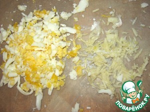Натереть яйца, измельчить чеснок