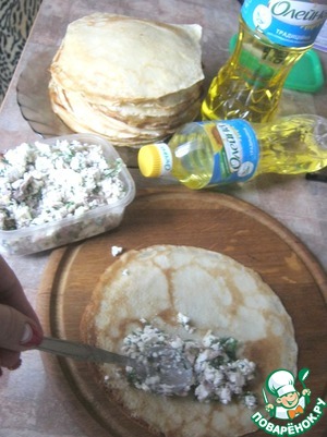 Выкладываем начинку на блины