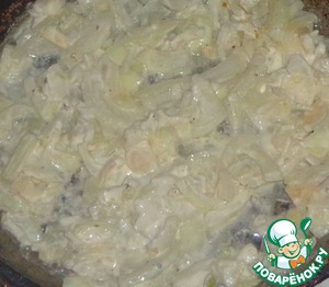 Переложить лук в сковороду. Накрыть крышкой и тушить до мягкости на медленном огне.