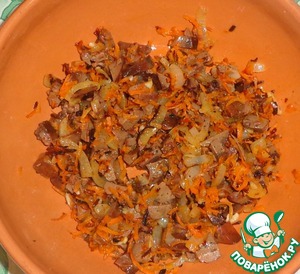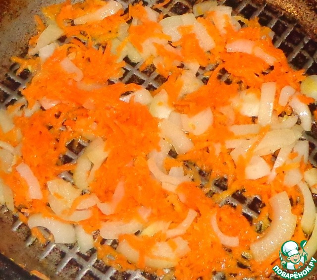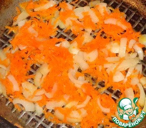 Натереть на крупной терке морковь, мелко порезать репчатый лук. На подсолнечном масле я обжариваю морковь с луком около 7 минут.