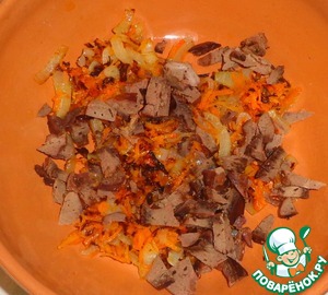 Гусиную отварную печень порезать средними кусочками. Смешать печень с овощами.