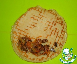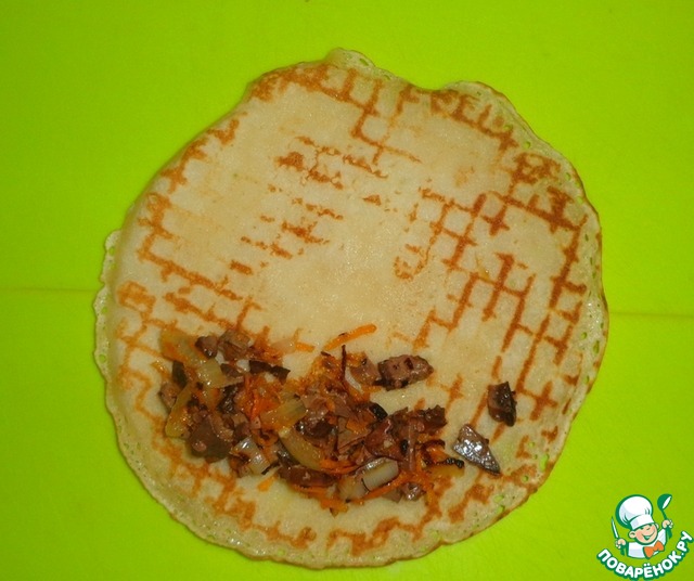 Добавить соль, черный молотый перец и чеснок, перемешать. Начинка для блинов готова.